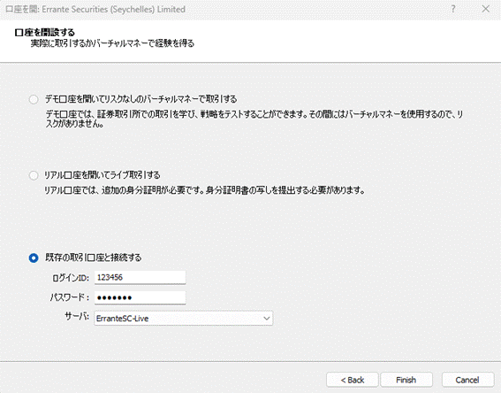 「既存のアカウント」を選び、ログイン番号、パスワードを入力して「完了(Finish)」をクリックしましょう。