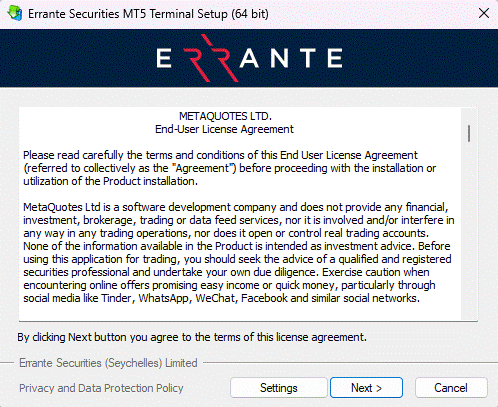 次に、Errante(エランテ)のMT5のライセンス同意画面が表示されたら「次へ(Next)」をクリックしましょう。